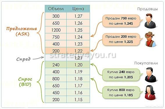 В центре сконцентрированы лучшие предложения. На покупку здесь самая высокая цена, а продажу — самая низкая. Разница между этими показателями называется спредом.