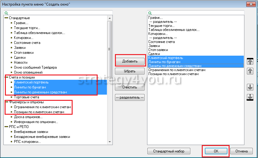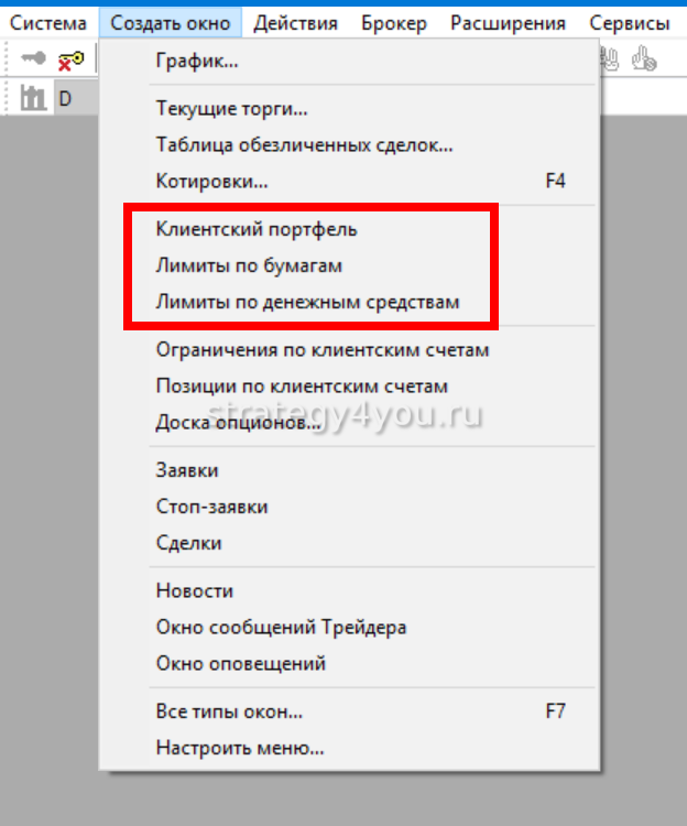 В случае, если в информационно-функциональном меню «Создать окно» нет пунктов по типу «Лимиты по денежным средствам/бумагам», «Ограничения по клиентским счетам», «Клиентский портфель» и т.д., нужно выбрать в меню «Создать окно/Настроить меню/Добавить/ОК». Назначения всех параметров в «Клиентский портфель» смотрят в Справке (F1).