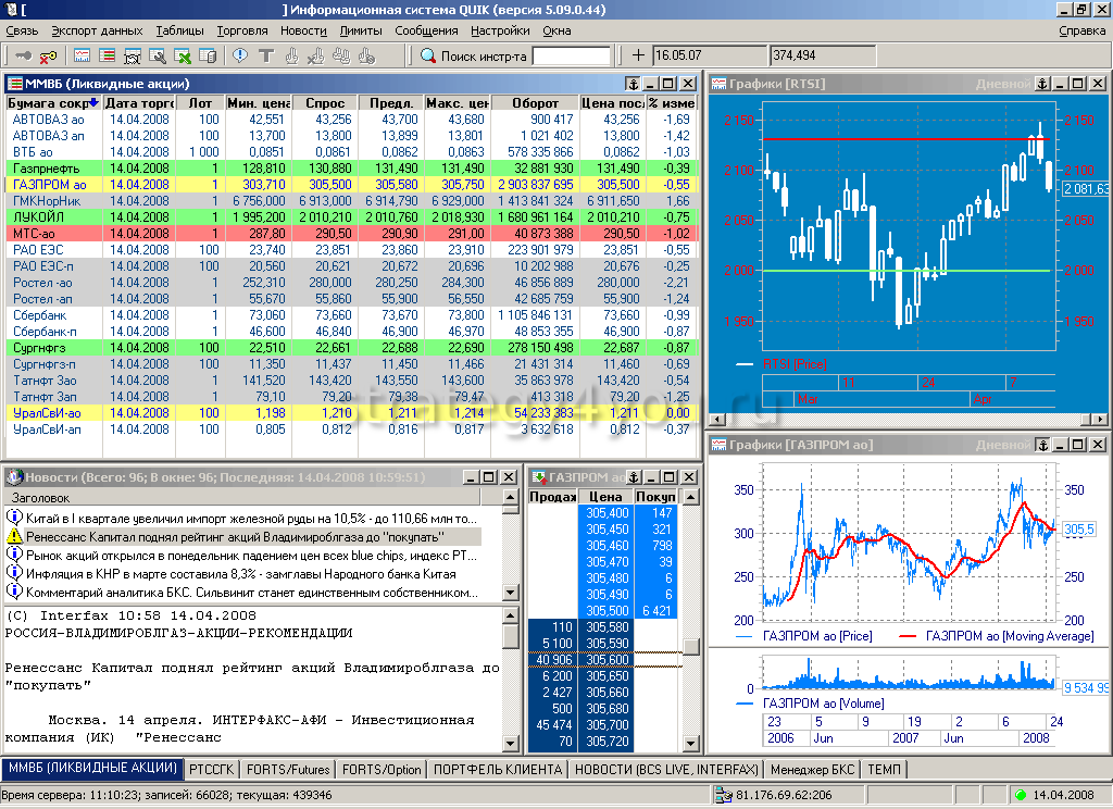 При первом запуске терминала достаточно сложно бывает разобраться, как настроить его: появляется множество таблиц, графиков, мигающих цифр. Отображаться все это может по-разному, в зависимости от версии программы и выбранного брокера. Так, у Quik 7 для торговли акциями интерфейс один, у других брокеров он может быть иным.