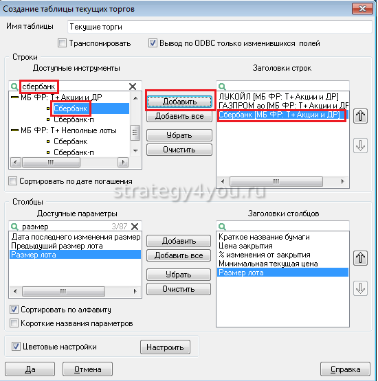- Таким же образом следует добавить все параметры, которые нужно увидеть в таблице, после чего нажать «Да». Назначение всех параметров можно увидеть в «Справке» по Quik, вызвав ее нажатием F1.