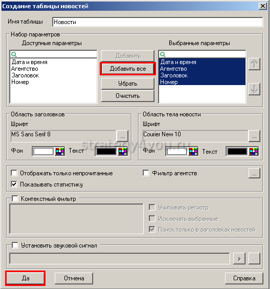 Если есть необходимость, можно настроить фильтры с выбором информационных агентств. Что для этого нужно сделать: правой кнопкой мыши нажать по верхней части новостного окна, выбрать «Редактировать таблицу», отметить галочкой «Фильтр агентств», в окне выбрать искомые агентства и подтвердить двойным выбором «Да».