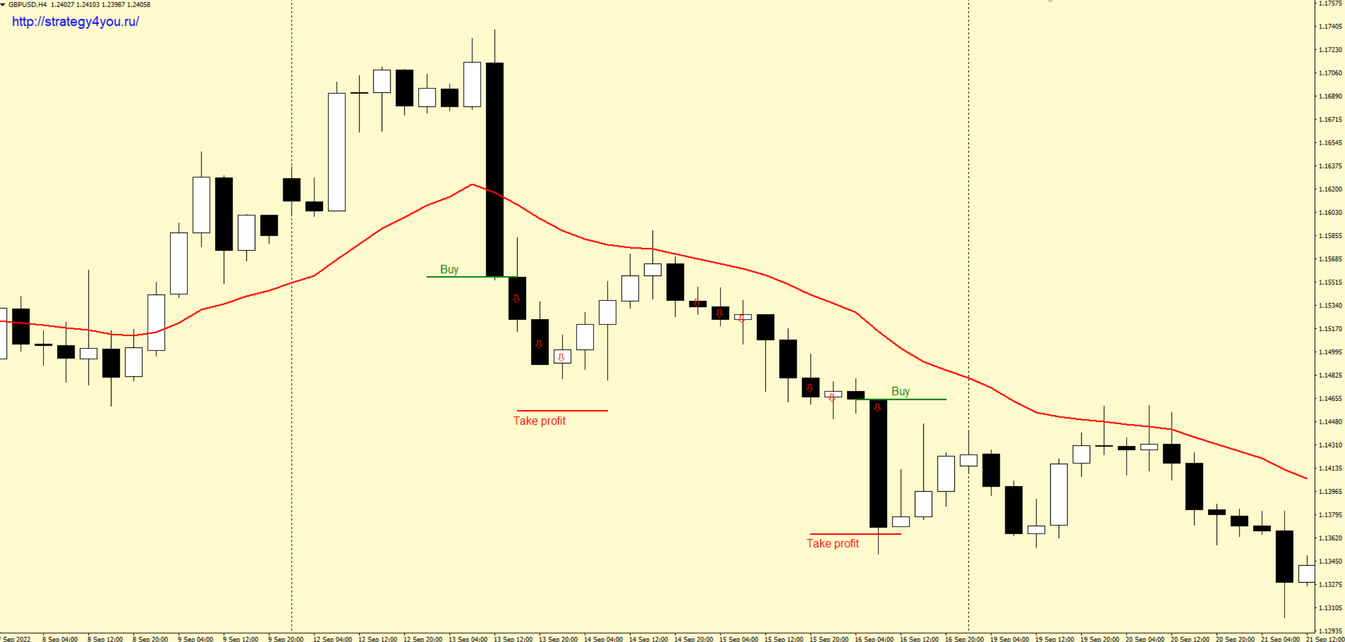2) Новая H4 свеча открывается ниже середины предшествующей свечи (середина свечи равна high – low).
