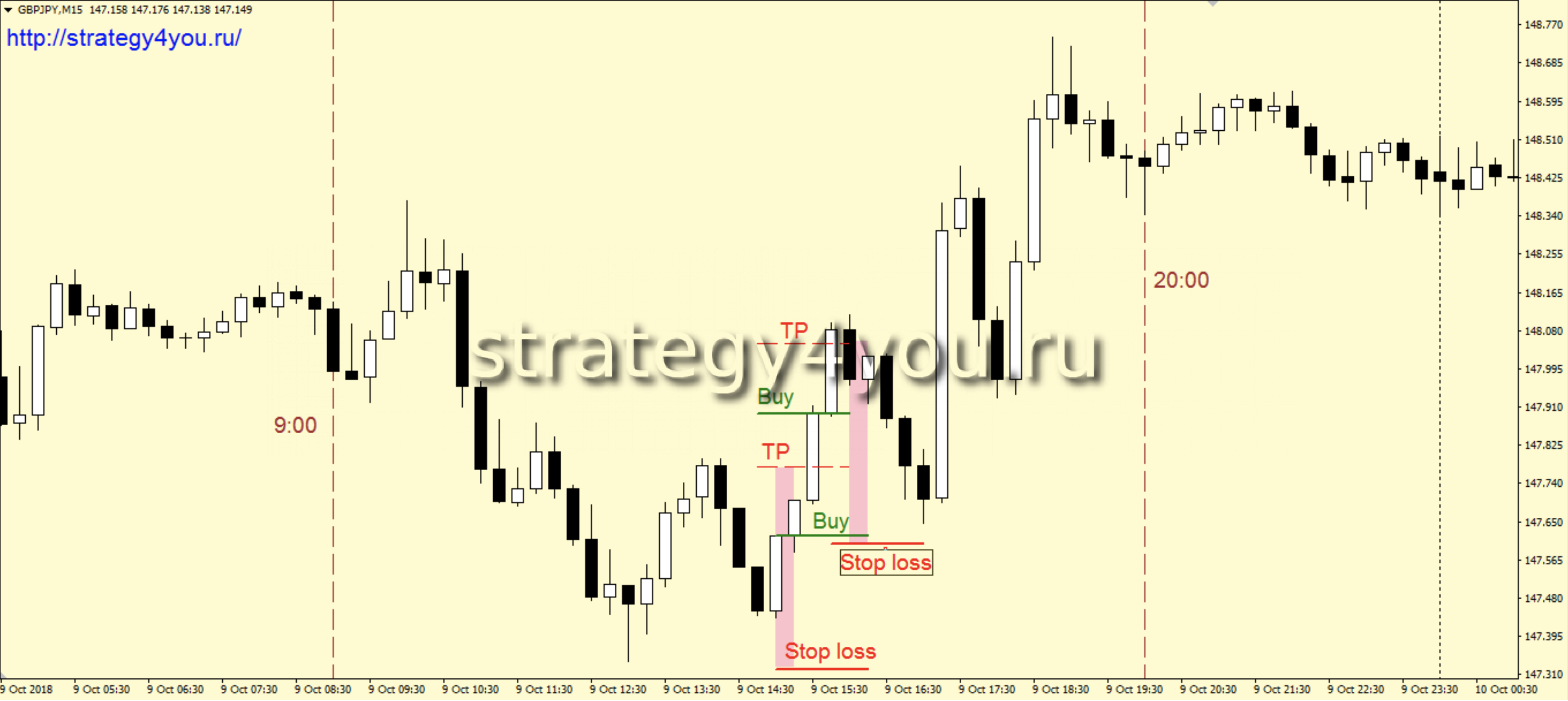 3) Как только данная свеча закрывается, заключается сделка на покупку.