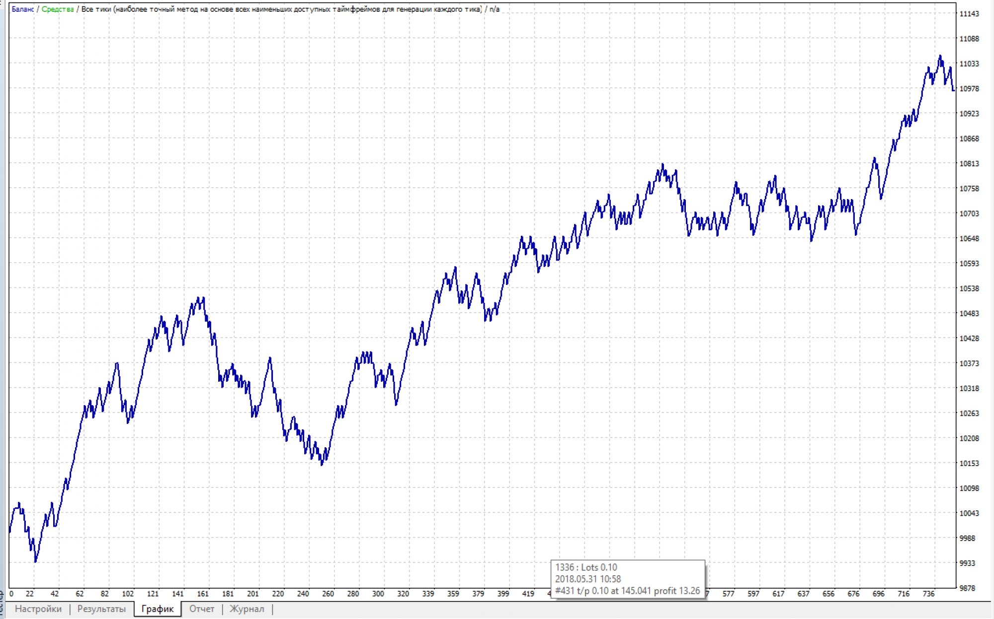 Автор стратегии указывает, что данная стратегия более прибыльна в осенний и весенний периоды. Однако мы протестировали ее с июня 2018 по середину октября 2018 года и все равно увидели неплохую прибыль. Прибыль за указанный период составила около +1000 пунктов (4 знака) и это всего за 3,5 месяца. По убыточным сделкам: более 2-х подряд стоп-лоссов за этот периодов не было, соответсвенно максимальная просадка — 60 пунктов.
