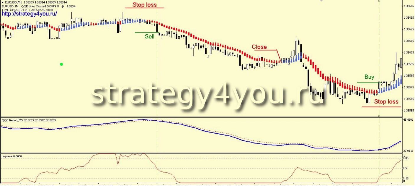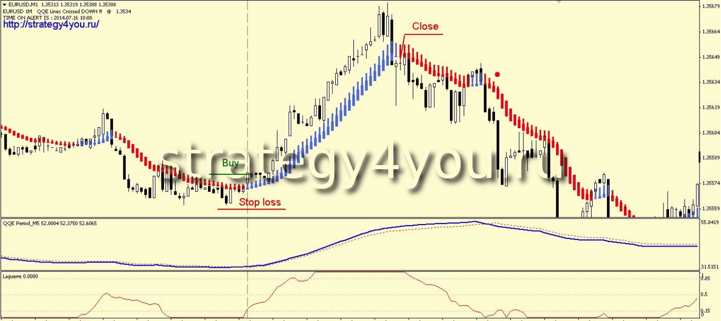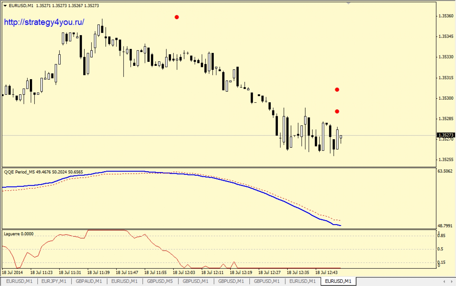 2) Индикатор QQE Alert MTF v5 – учитывает пятиминутный тренд. При пересечении его линий подает звуковой сигнал, что позволяет не следить за графиком постоянно.