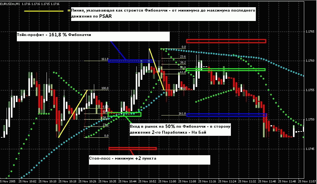 conceptor, сетку строите, а затем сделка заключается или на пробитии уровня 50% по фибоначчи или на отскоке от 50% по Фибоначчи, но гравное условие — открывать сделки нужно только в сторону 2-го параболика (0,005 & 0.05) — голубого ! и временной интервал не забывайте — только с 9 до 11 по GMT.