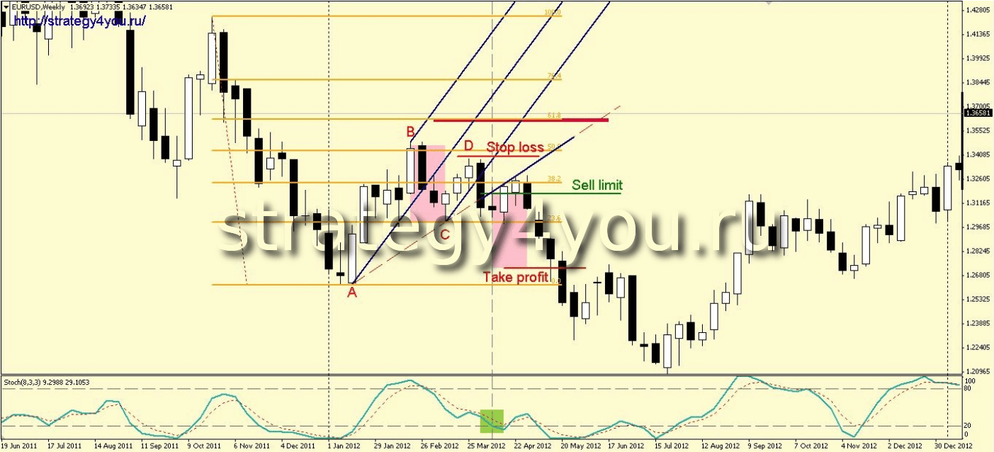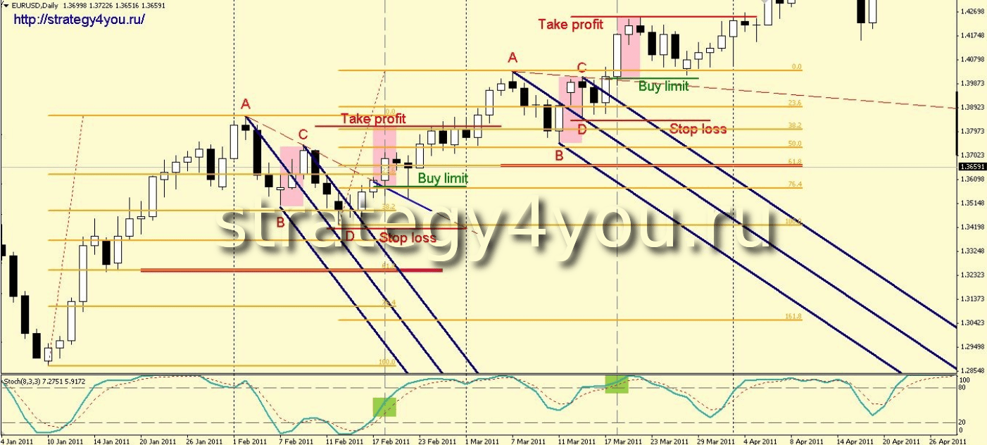 Как точка «С», так и точка «D» не должны пробить вверх уровень фибоначчи 61,8 растянутого на последнее нисходящее значимое движение. Расположение точки «D» относительно точки «С» никакой роли не играет.