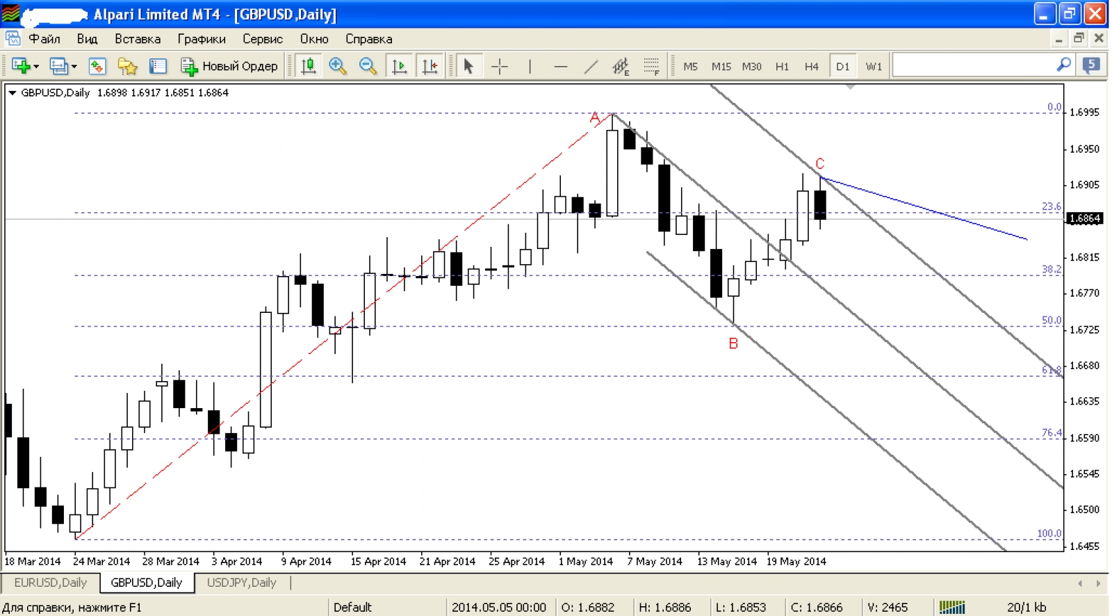 По точка «А», «В» и «С» строим Вилы Эндрюса. Важно чтобы после отката от точки «С» серединная линия Вил не была пробита вверх, то есть свеча не должна закрываться выше этой линии. Еще лучше если вообще до нее не дойдет. Этот последний максимум мы обозначим как тока «D».