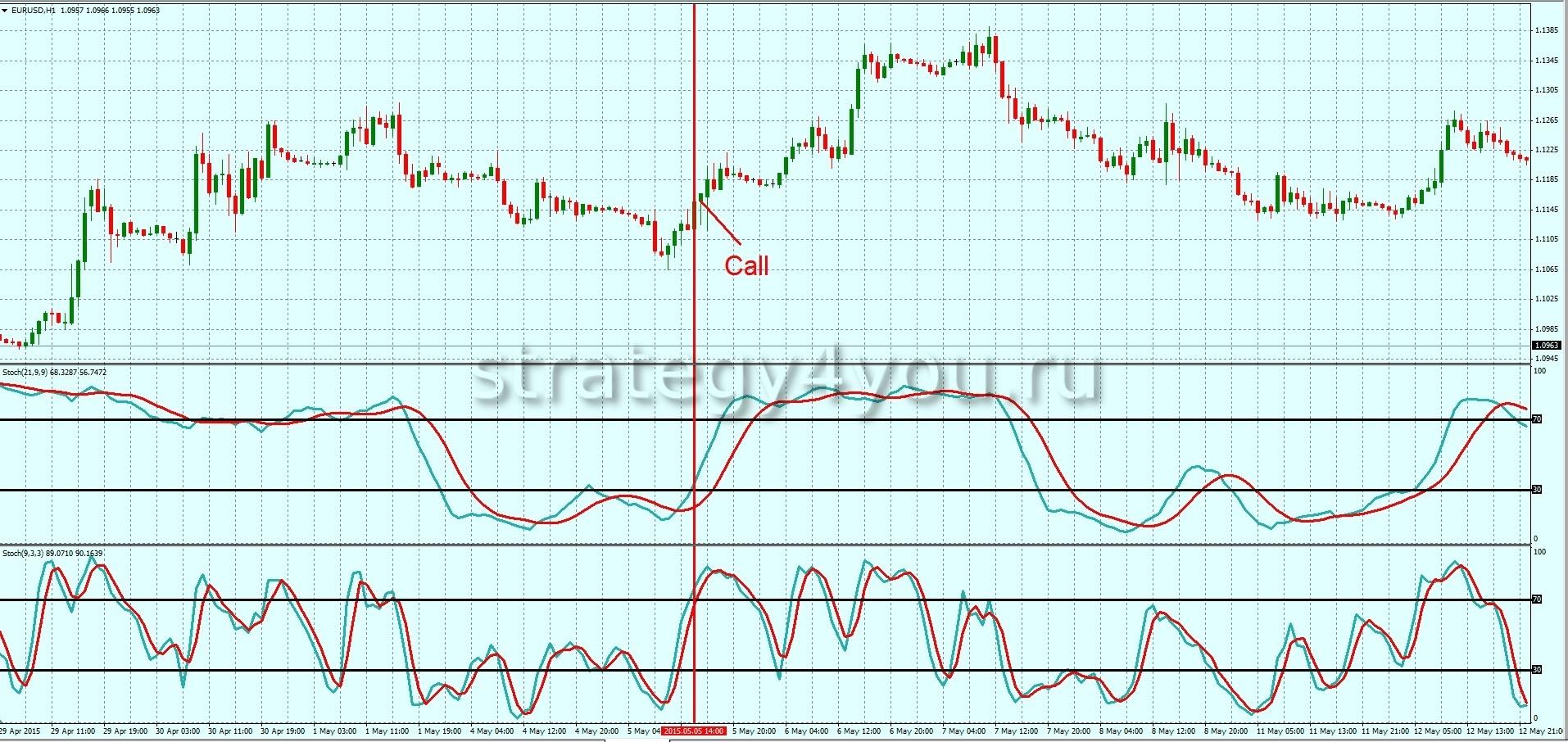 Когда Stochastic выйдет из зоны перепроданности (перекупленности), в зависимости от господствующей тенденции, открывается сделка.