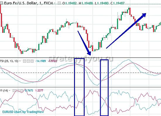 - ТС строится на 2 технических индикаторах — True Strength Indicator и Vortex со стандартными настройками.