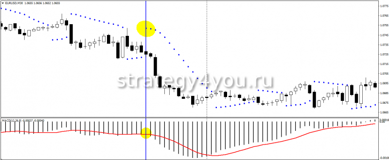 Еще одна проверенная стратегия для бинарных опционов для периода 5 минут, основанная на 2 индикаторах — МАСD и Parabolic SAR. Длительность сделки — 1 свеча (5 минут).