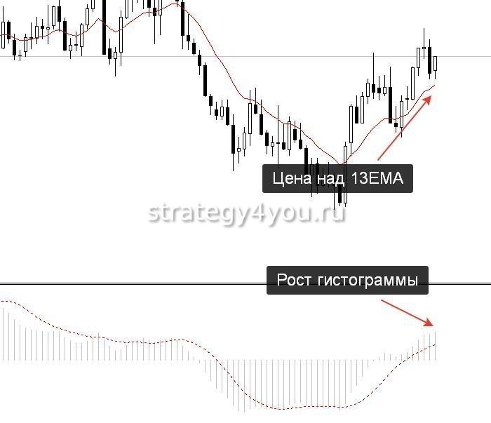 Для определения тенденций в системе используют скользящую среднюю EMA 13 и трендовый осциллятор MACD. Если цена находится над мувингом, а гистограмма MACD выше нуля, рынок растет.