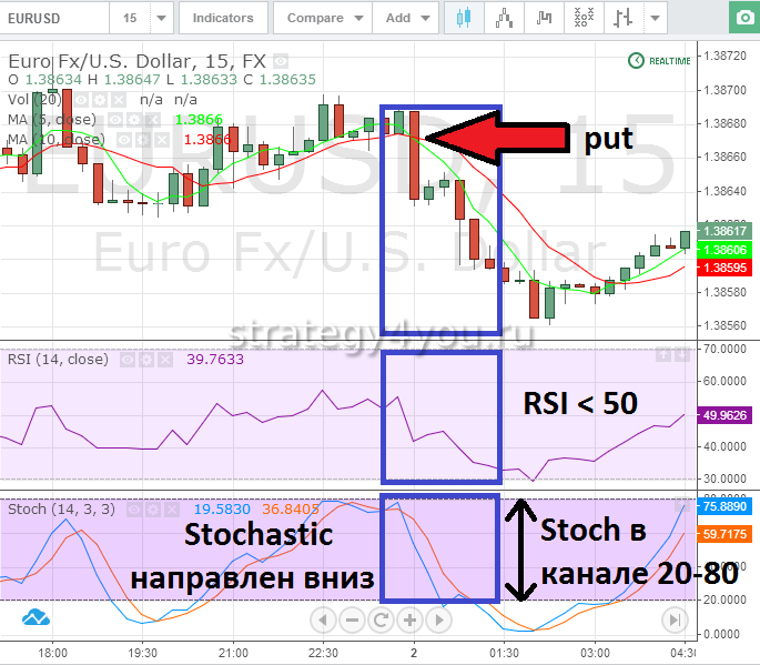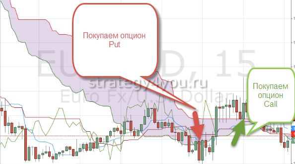 Система рассчитана на то, что на графике М5 открывают сделку на 3-5 свечей, т.е. 15-25 минут. Когда цена окажется в зоне перекупленности, направление торгов меняется на Put.
