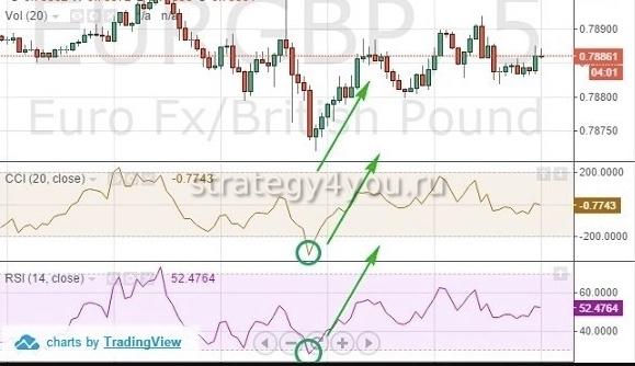 Считается, что присутствующая тенденция затухает, когда оба инструмента заходят в зоны перекупленности и перепроданности. Для профитной работы нужно дождаться сигнала от 2 индикаторов. Сделка открывается на 5 свечей рабочего интервала.