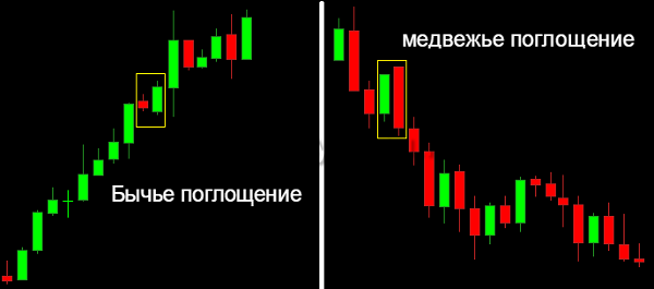 Сигнал для сделки — свечной паттерн «Бычье» или «Медвежье поглощение» в продолжение тенденции.