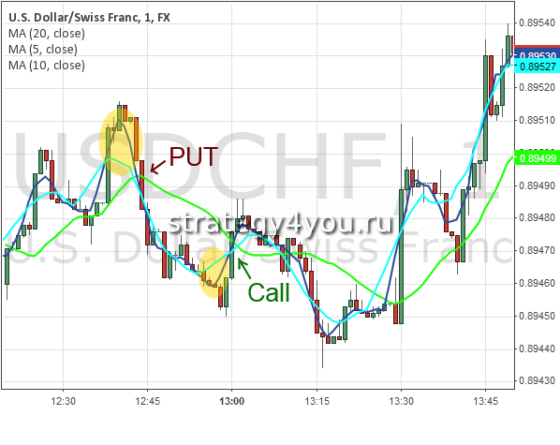 Для данной стратегии актуальным будет выбор тридцатиминутного или часового графика. Это подходящий вариант для тех, кто торгует внутри дня. Когда наблюдается пересечение SMA20 вниз или SMA5 вверх, это является сигналом на продажу или покупку, соответственно. Если наблюдется пересечение линий вниз или вверх – это сигналы для Put и Call. Срок работы опциона составляет 1-3 часа. Можно использовать больше линий МА, пробуя и тестируя разные подходы, чтобы найти идеальную комбинацию.