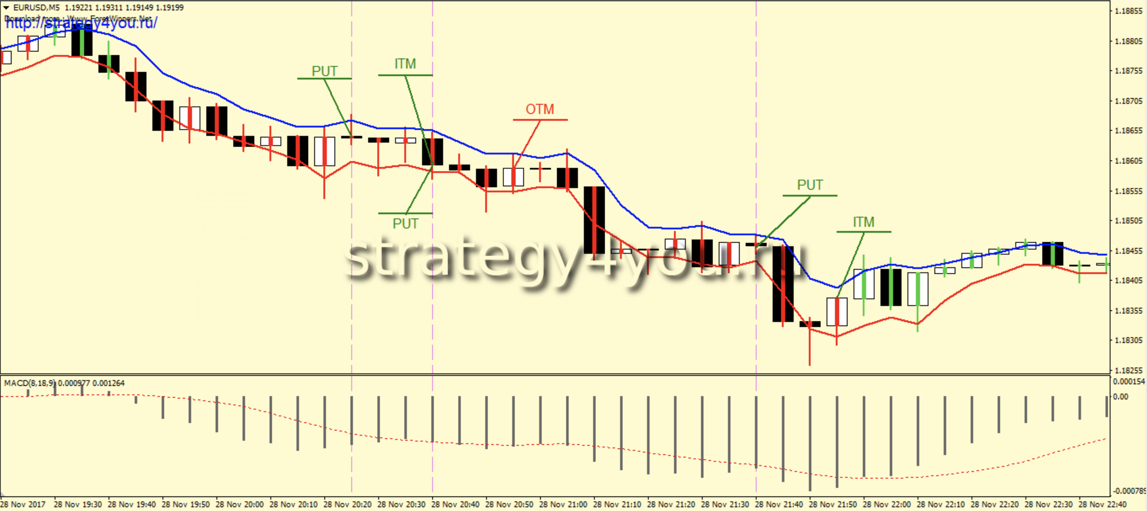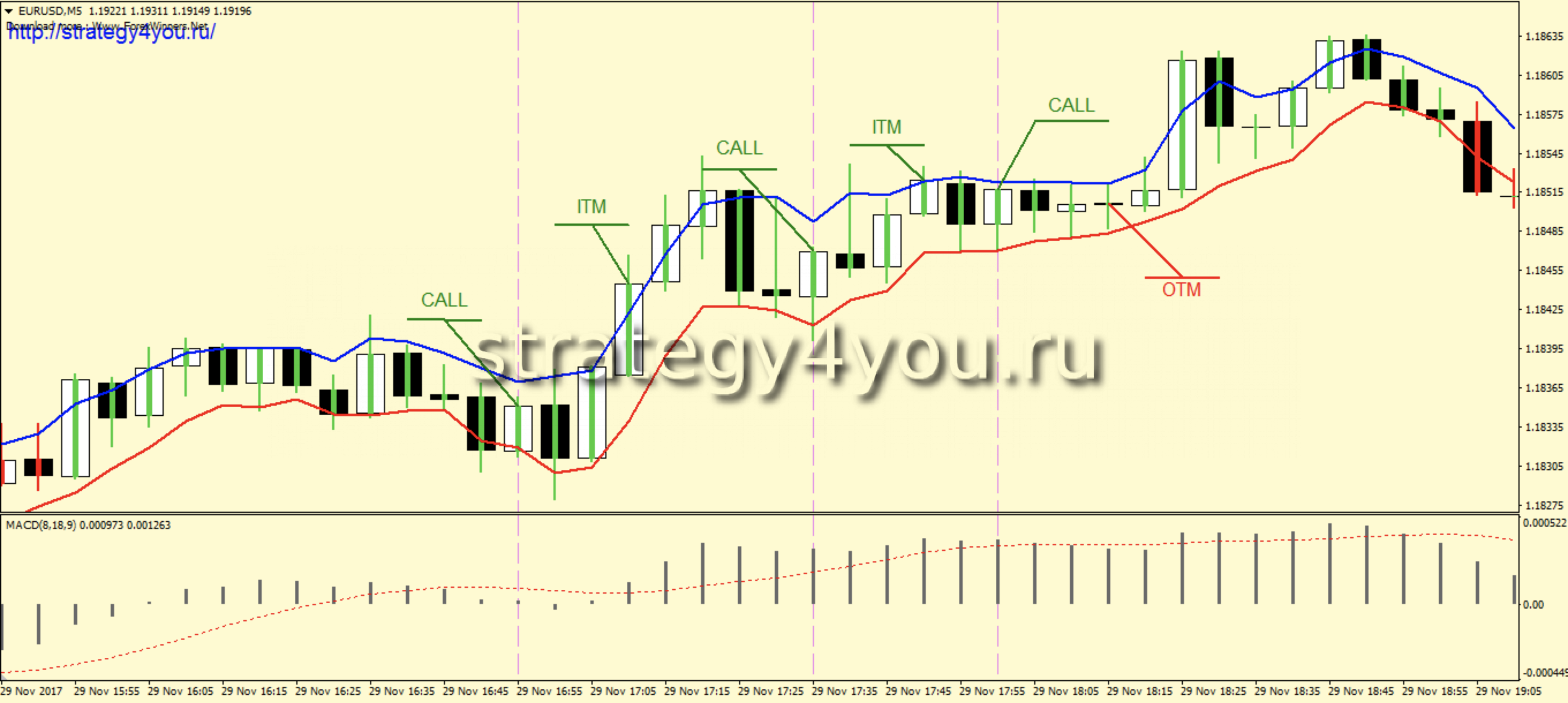 4) После соблюдения всех условий, на открытии следующей свечи заключается сделка на понижение.