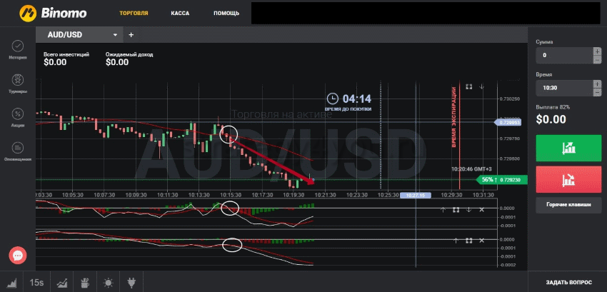 Заключать контракты вниз можно в том случае, если график активов оказался ниже индикатора SMA, а на узко диапазонном MACD линии осцилятора преодолели шкалу в нижнем направлении.
