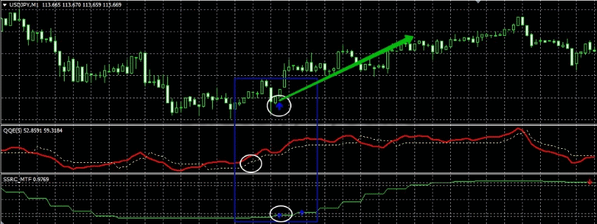 - Мувинг SSRC после опускания ниже уровня перепроданности поднимается вверх, а на графике активов образуется сигнальная стрелка вверх.