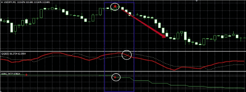 - Мувинг SSRS находится выше сектора перекупленности и разворачивается вниз, а на графике появляется характерный сигнал.