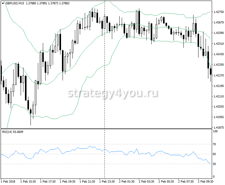 Специфика стратегии основана на пересечении линией WMA скользящего графика Боллинджера на базе пересечения сигналом RSI уровня 50%.