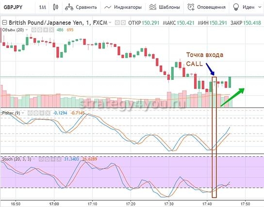 Контракт со сроком экспирации 5 свечей заключается при прохождении через линии обоих индикаторов, так как означает начало роста актива.