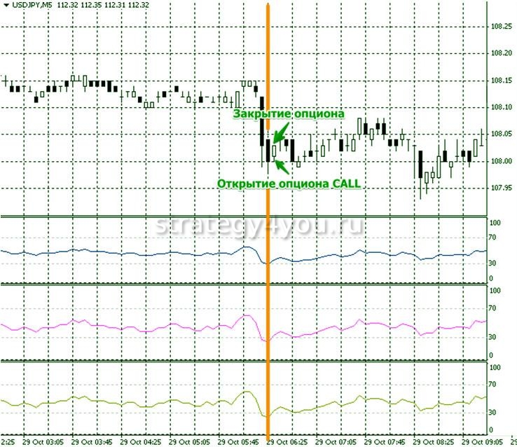При продажах действуют противоположные правила. 3 осциллятора должны оказаться в области перекупленности — в такой момент при открытии следующей пятиминутной свечи покупается опцион Put.