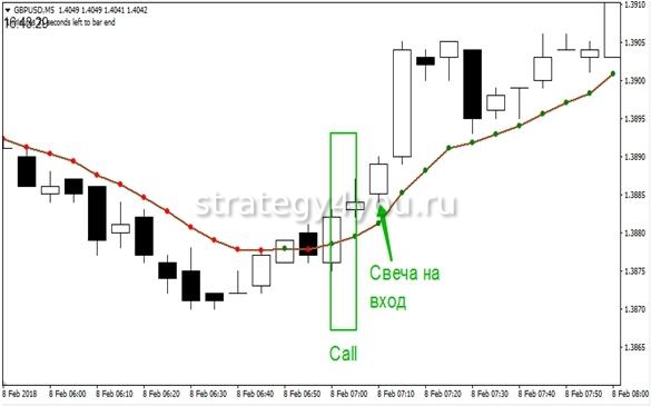 При применении торговой тактики используются простые знаки. Для приобретения опциона Call требуется наличие на графике 2 восходящих свечей рядом и 2 зеленых отметок на инструменте VarMovAVg, что свидетельствует о продолжающейся тенденции вверх. При совпадении условий осуществляется вхождение в сделку при появлении третьей свечи.
