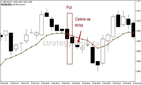 В сделках Put действуют наоборот: при появлении на графике валют 2 нисходящих свечей и точек красного цвета на инструменте покупается опцион Put.