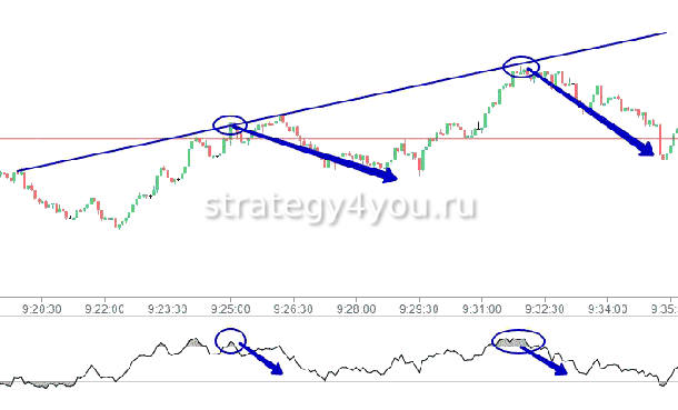 Тактика при складывающейся противоположной ситуации меняется. Сигнал на покупку опциона Put в этом случае означает, что прослеживается восходящая тенденция. В этом случае уровень индикатора RSI зайдет за пределы позиции, указывающие на отметку 70.