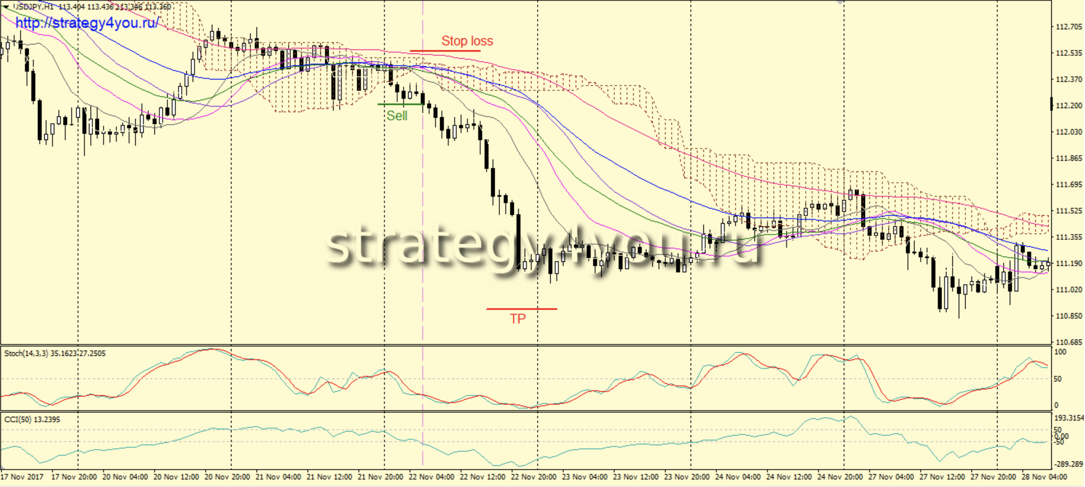 1) Очередная H1 свеча выходит вниз из облака и закрывается ниже.
