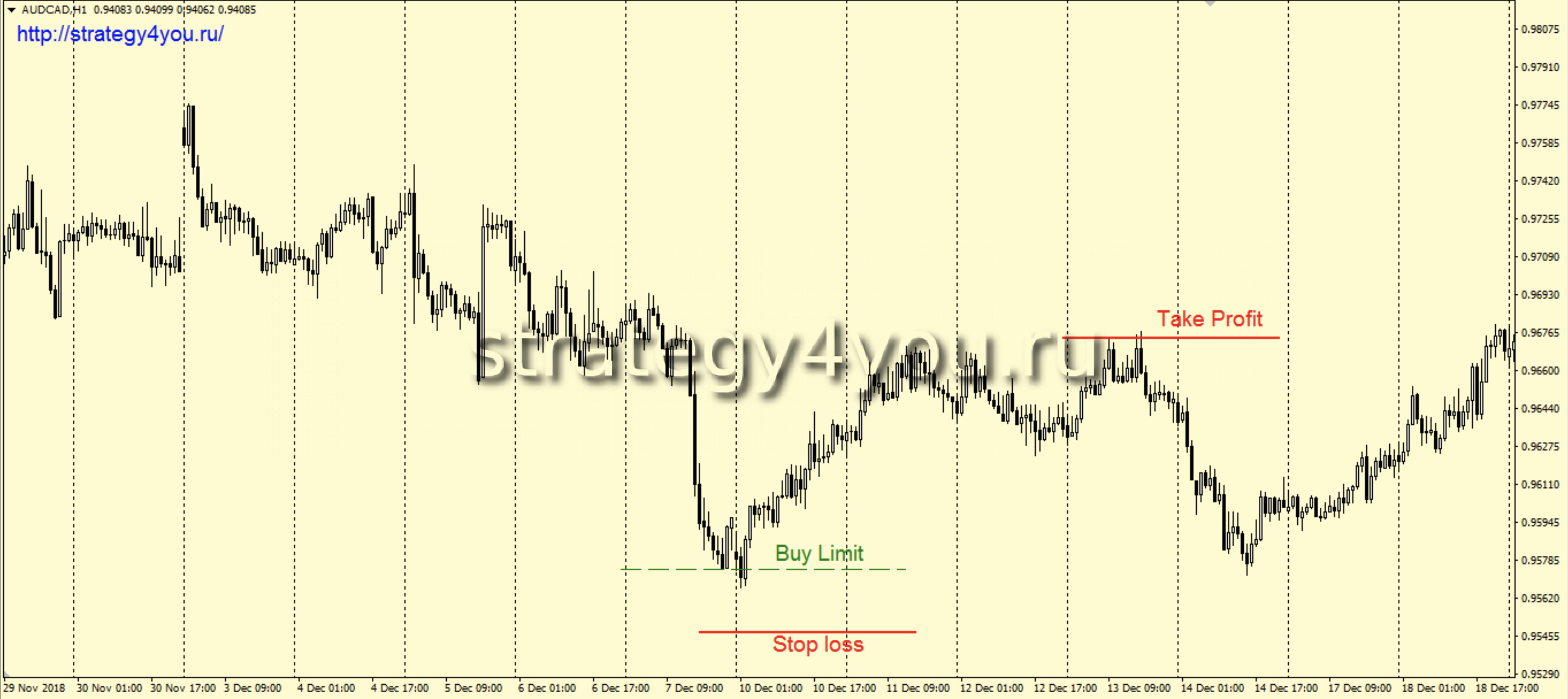 5) На часовом интервале по минимальной цене закрытия часовой свечи, которая зафиксировала минимальную цену закрытия в течении всего предыдущего дня, следует установить отложенный ордер на покупку Buy Limit.