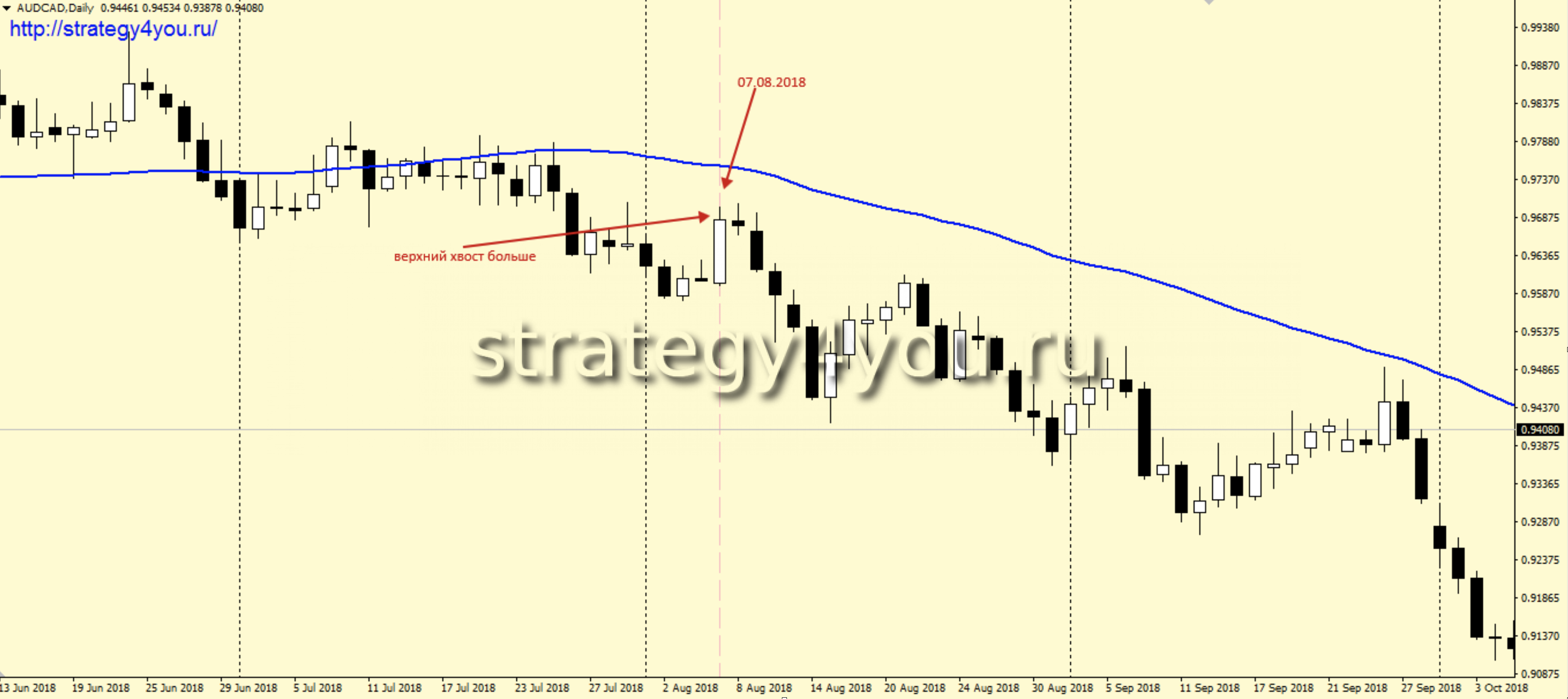 2) Формируется D1 свеча с белым телом, у которой верхний хвост больше нижнего.