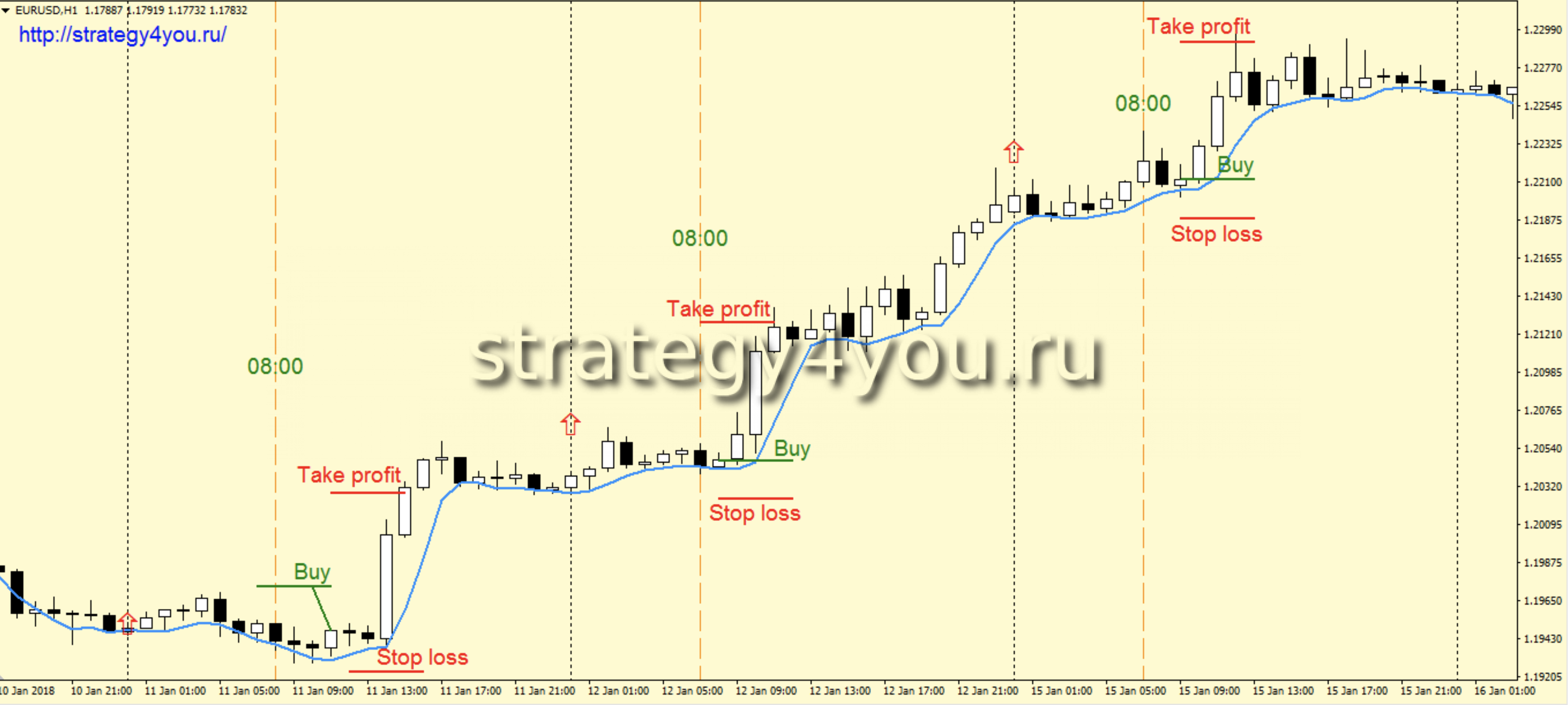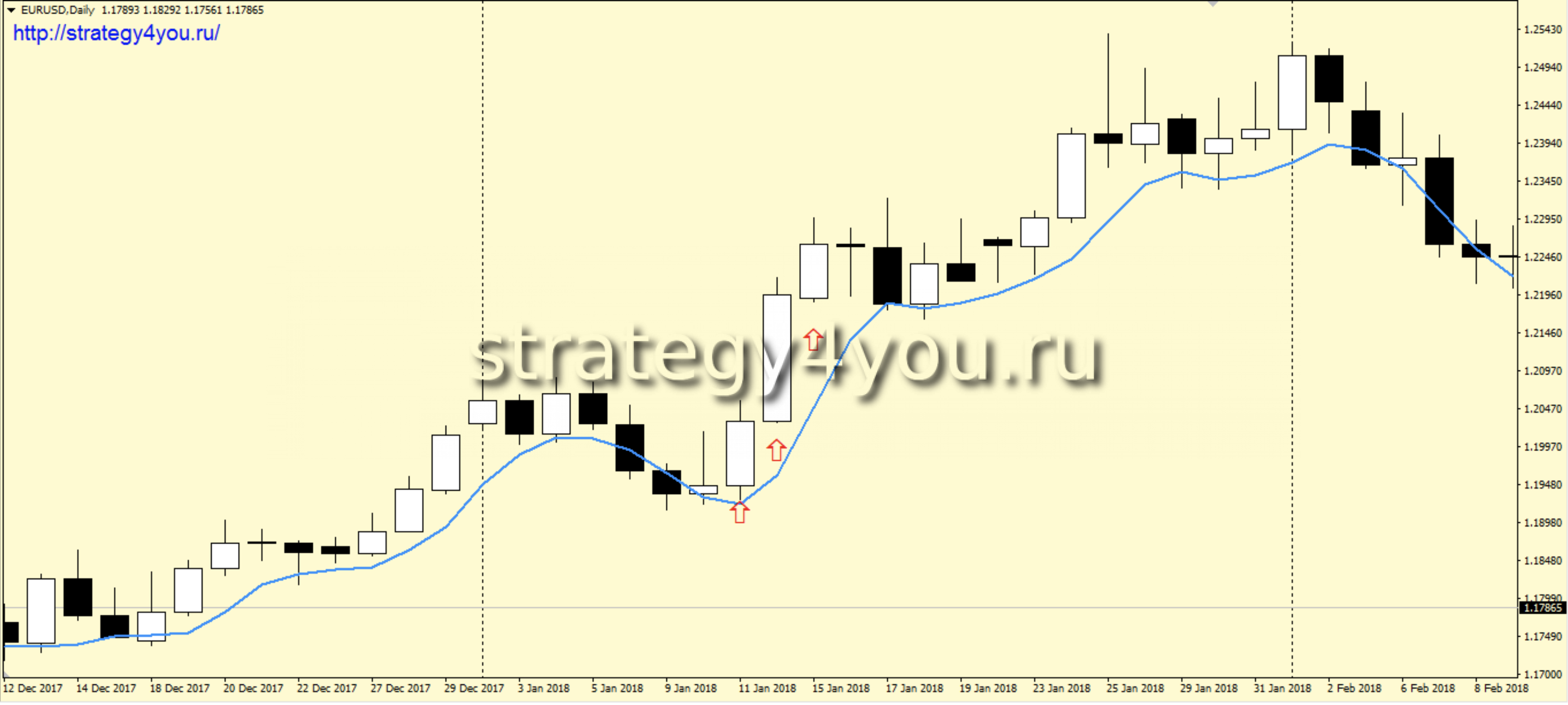 2) На часовом интервале с 8:00 EET (время терминала Альпари) первая же белая свеча, закрытая выше скользящей средней является сигналом на покупку.