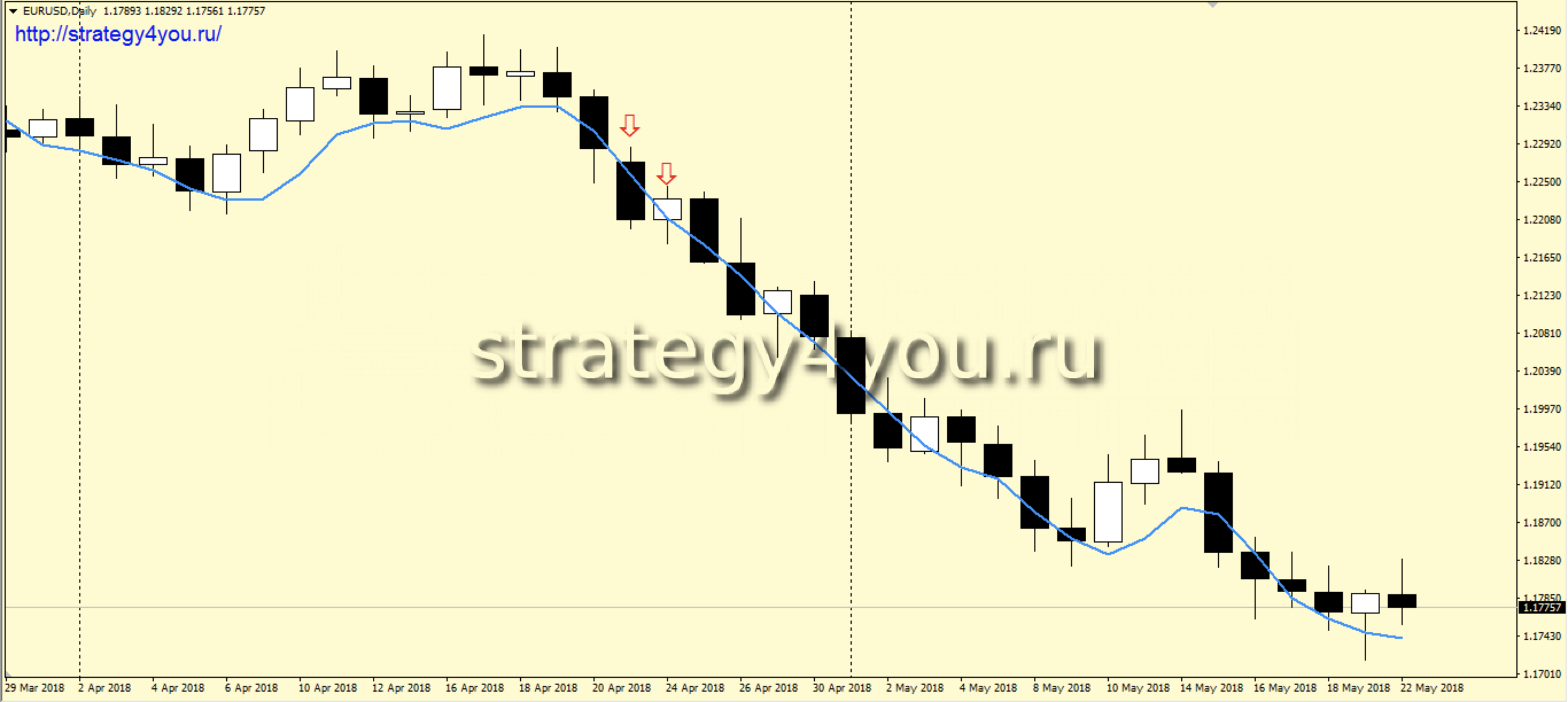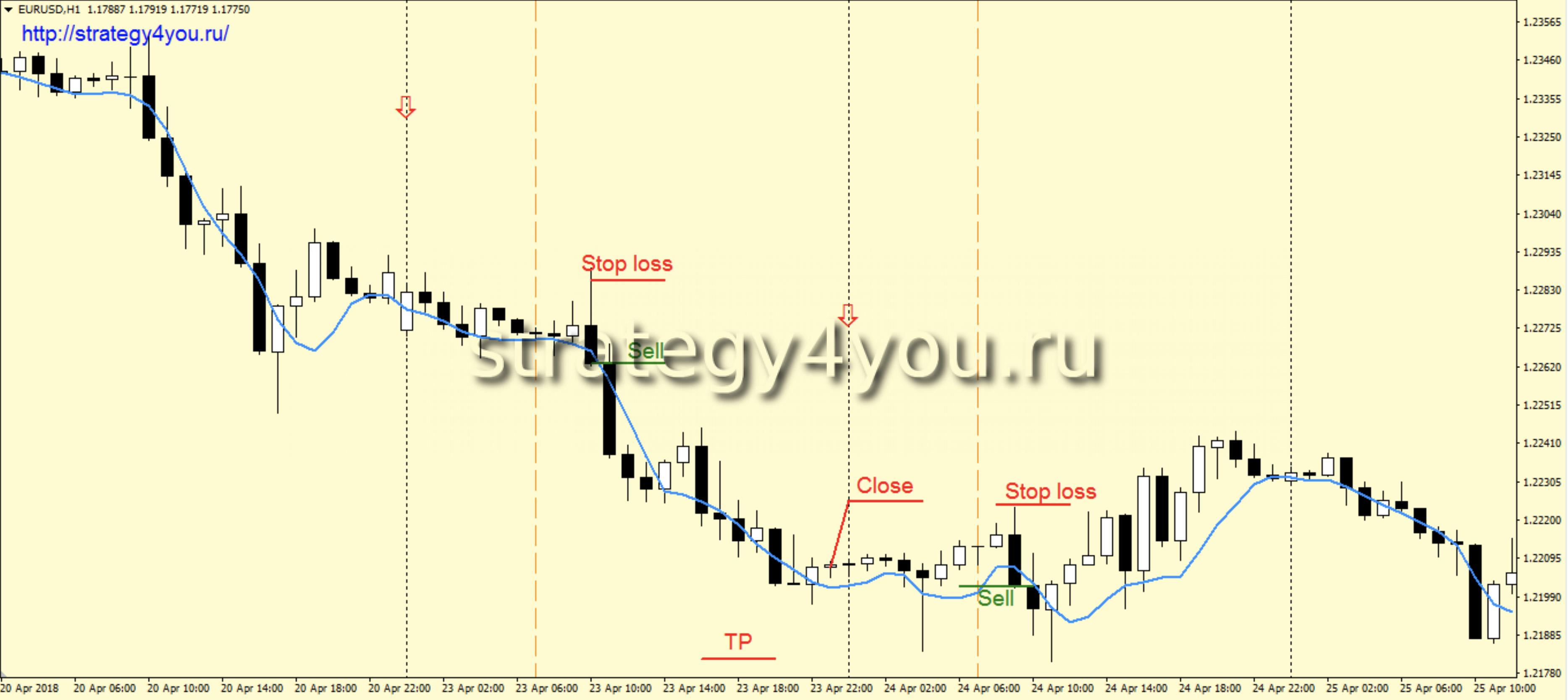 2) На H1 интервале с 8:00 EET (время терминала МТ4 Альпари) первая же черная свеча, закрытая ниже скользящей средней является сигналом для заключения сделки на продажу.