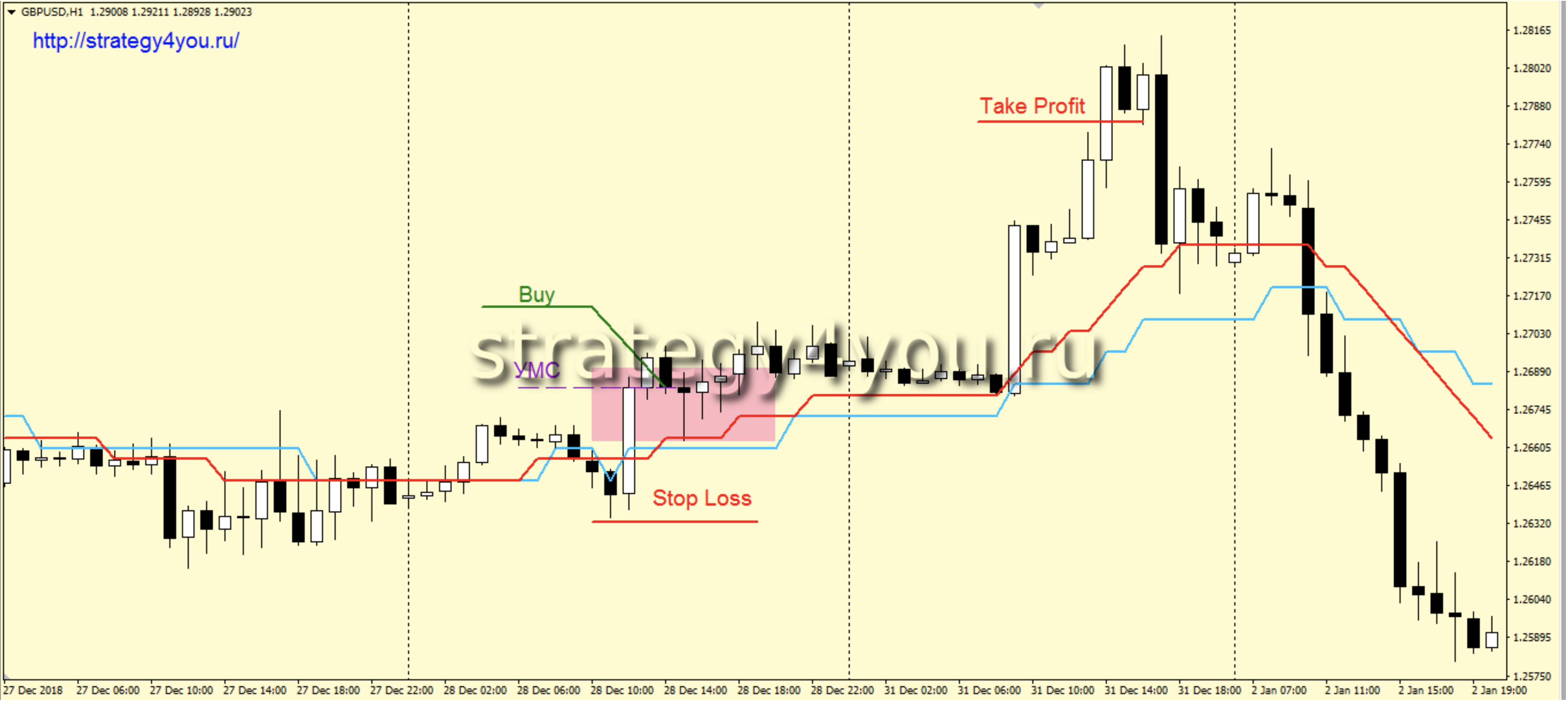 2) Цена пересекает МНСС снизу вверх и очередная свеча закрывается выше.