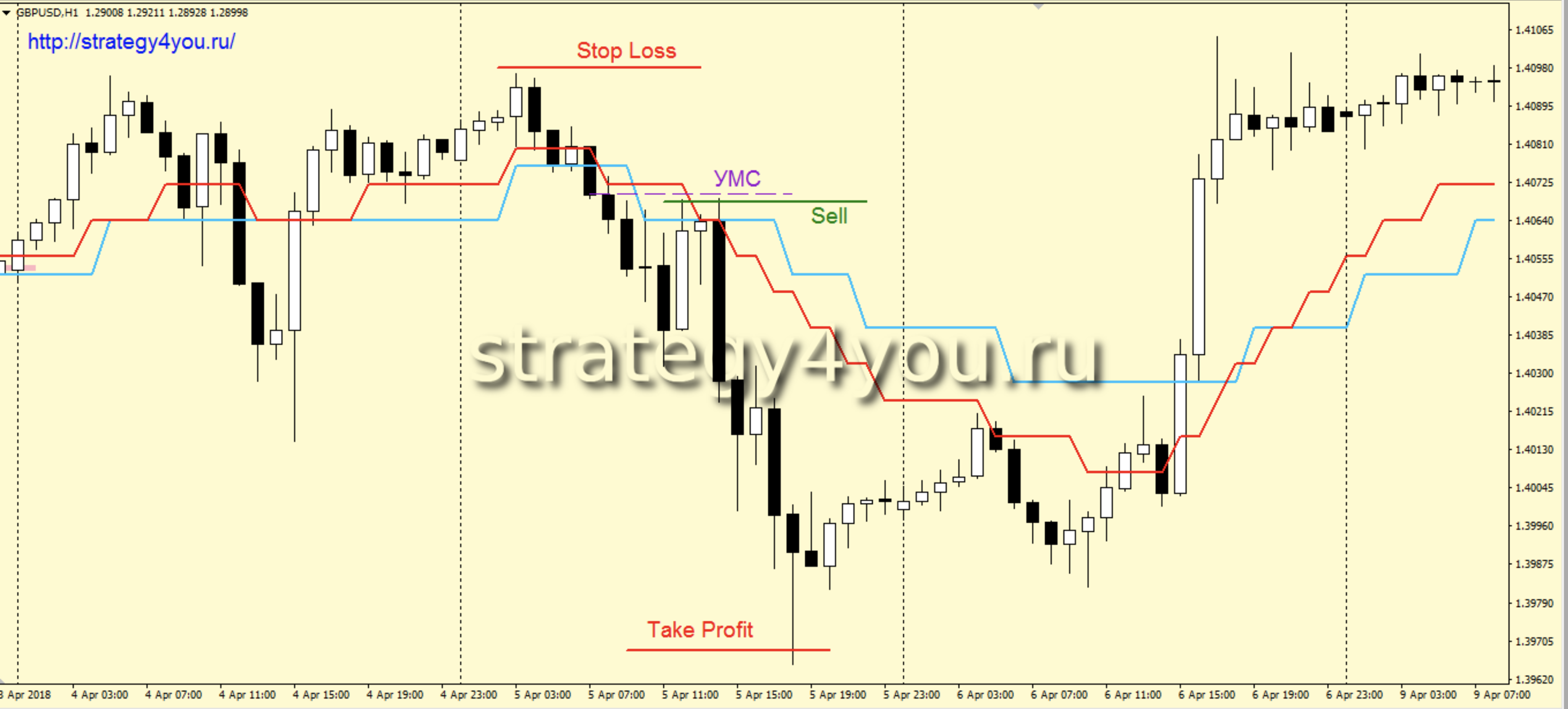7) Страховочный ордер — Stop loss устанавливается выше локального максимума, но он должен быть больше 25 пунктов и однозначно не больше 50. Так же стоп-лосс должен находиться выше 2-х скользящих средних.