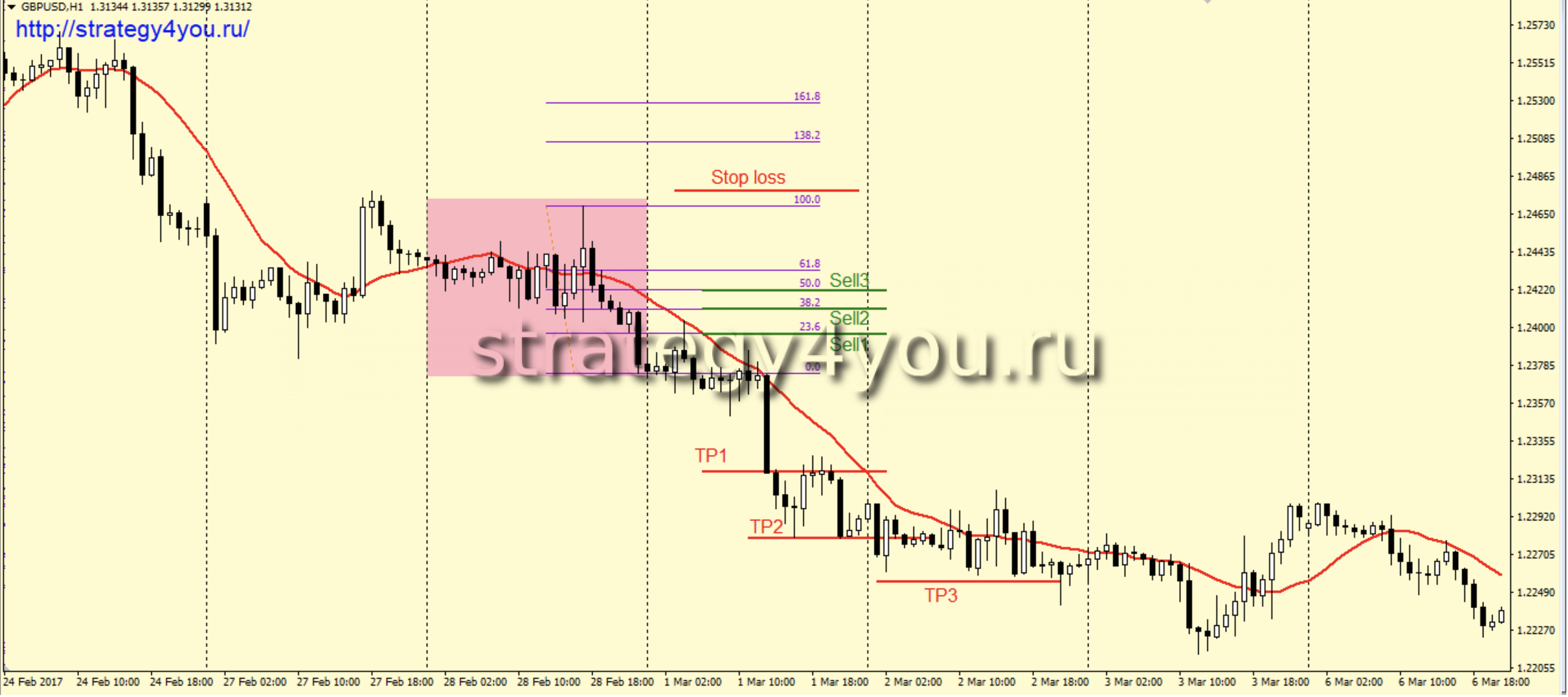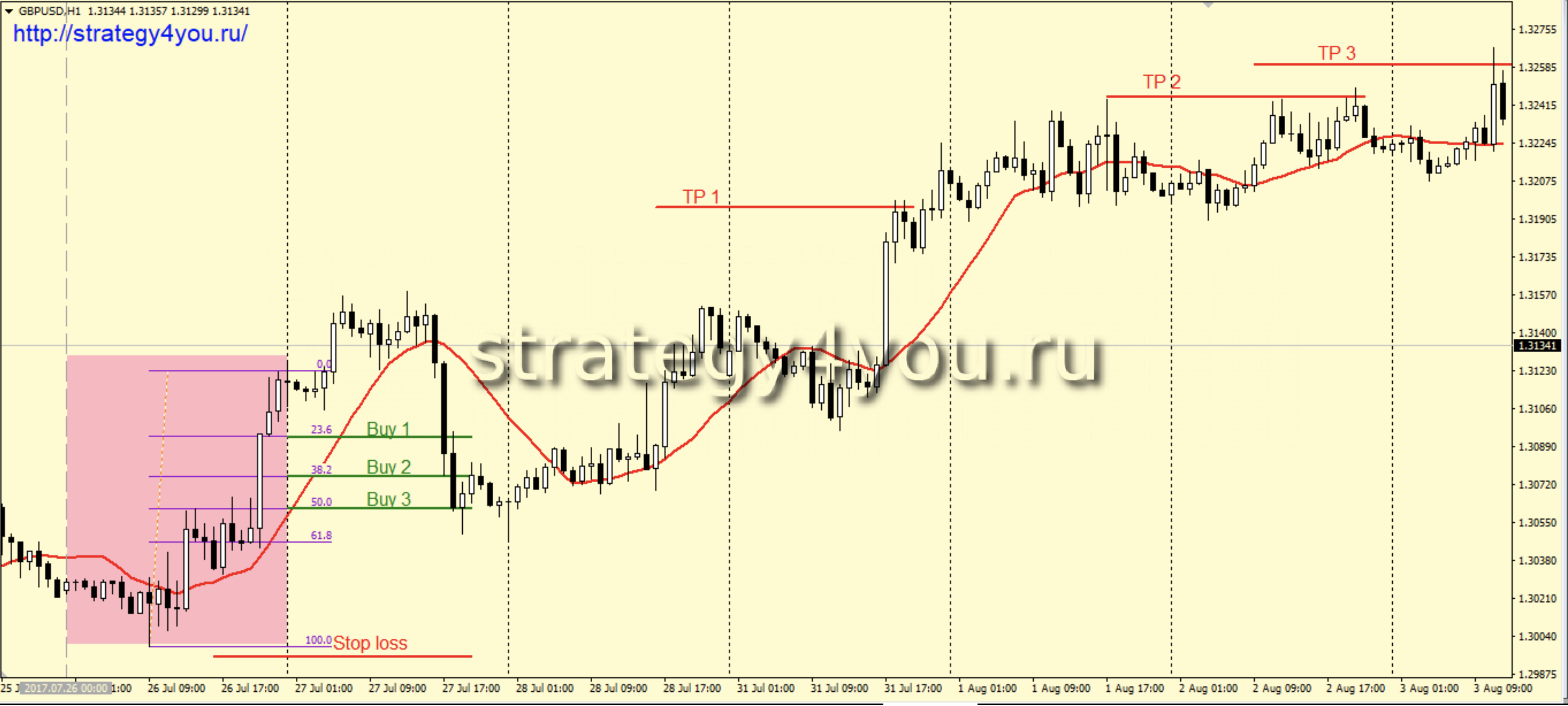 5) Вход осуществляется от уровней 23,6, 38,2 и 50. Если цена выше уровня, то используем ордер Buy Limit, если ниже – Buy Stop.