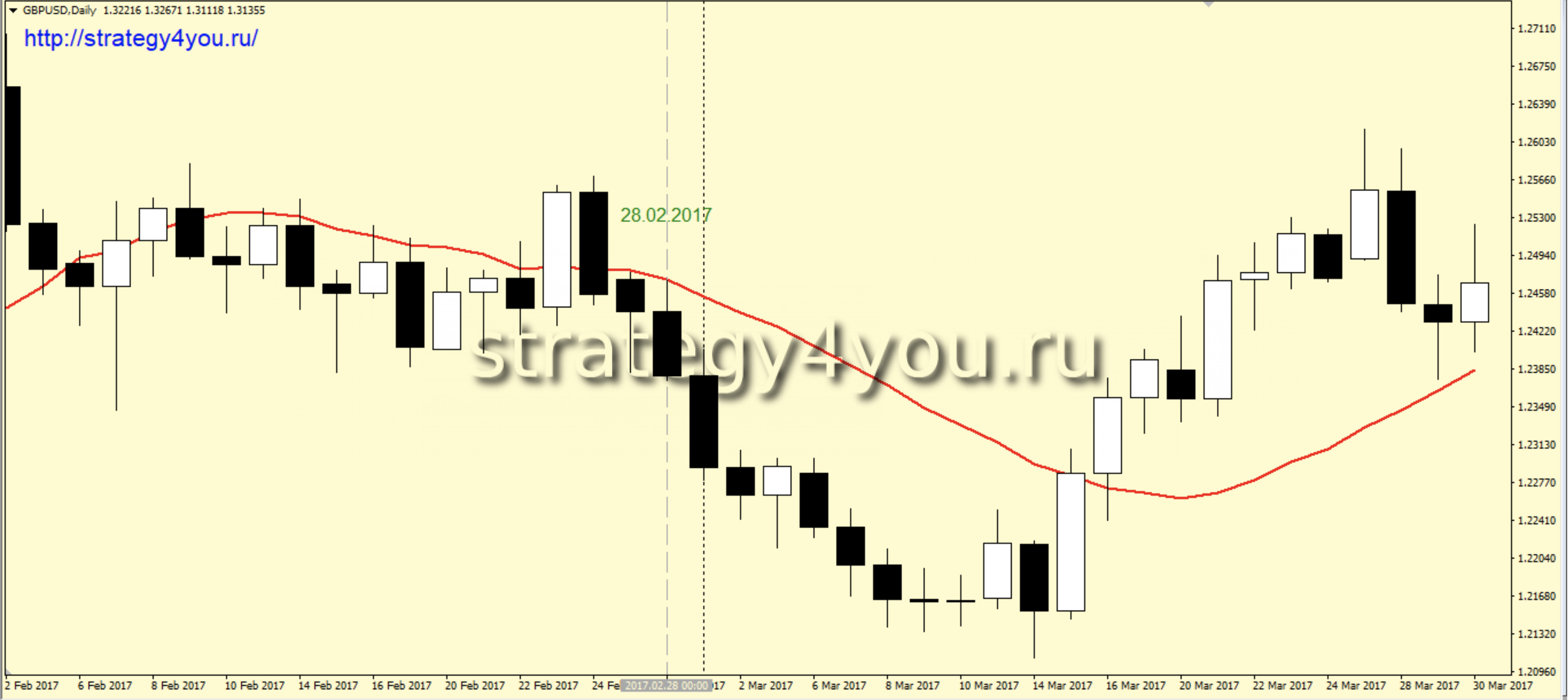 1) Цена на графике валютной пары находится ниже скользящей средней.