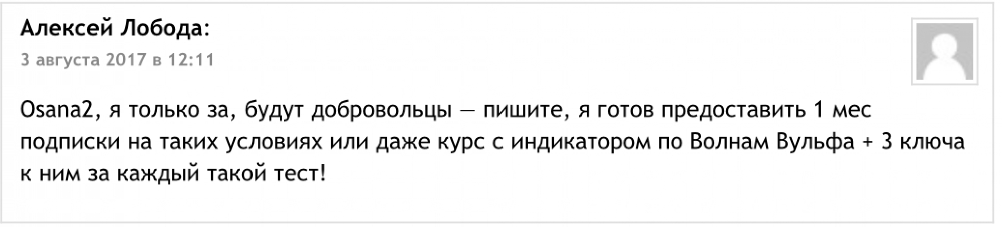 Алексей Лобода, я с удовольствием возьмусь тестировать данную стратегию на предложенных Вами условиях. Поскольку данная ТС использует Фибо, она очень близка моей ТС. Начало теста 7 августа 2017г. Окончание теста 6 февраля 2017 года или полный слив депо..