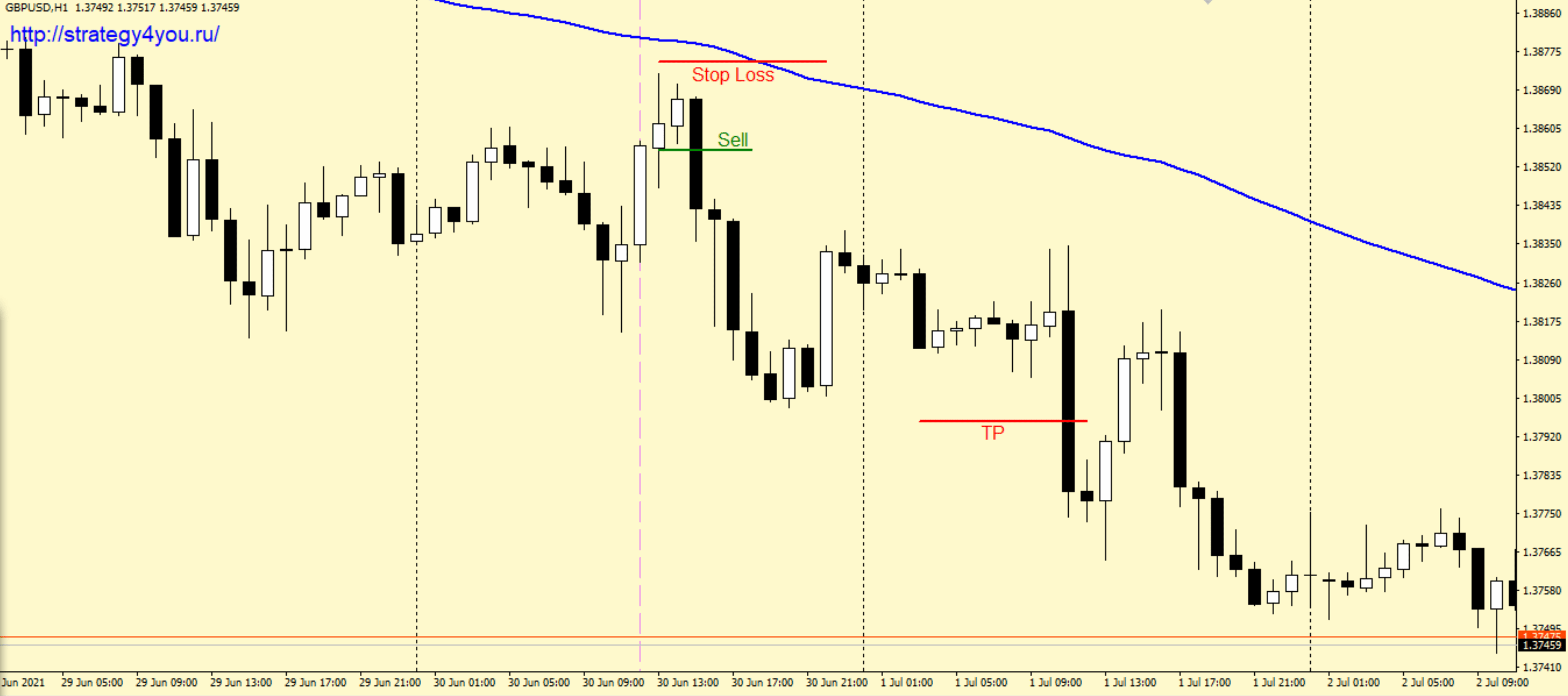 1) Цена открытия 1-ой часовой свечи торгового дня находится ниже мувинга на графике Фунт-доллар.
