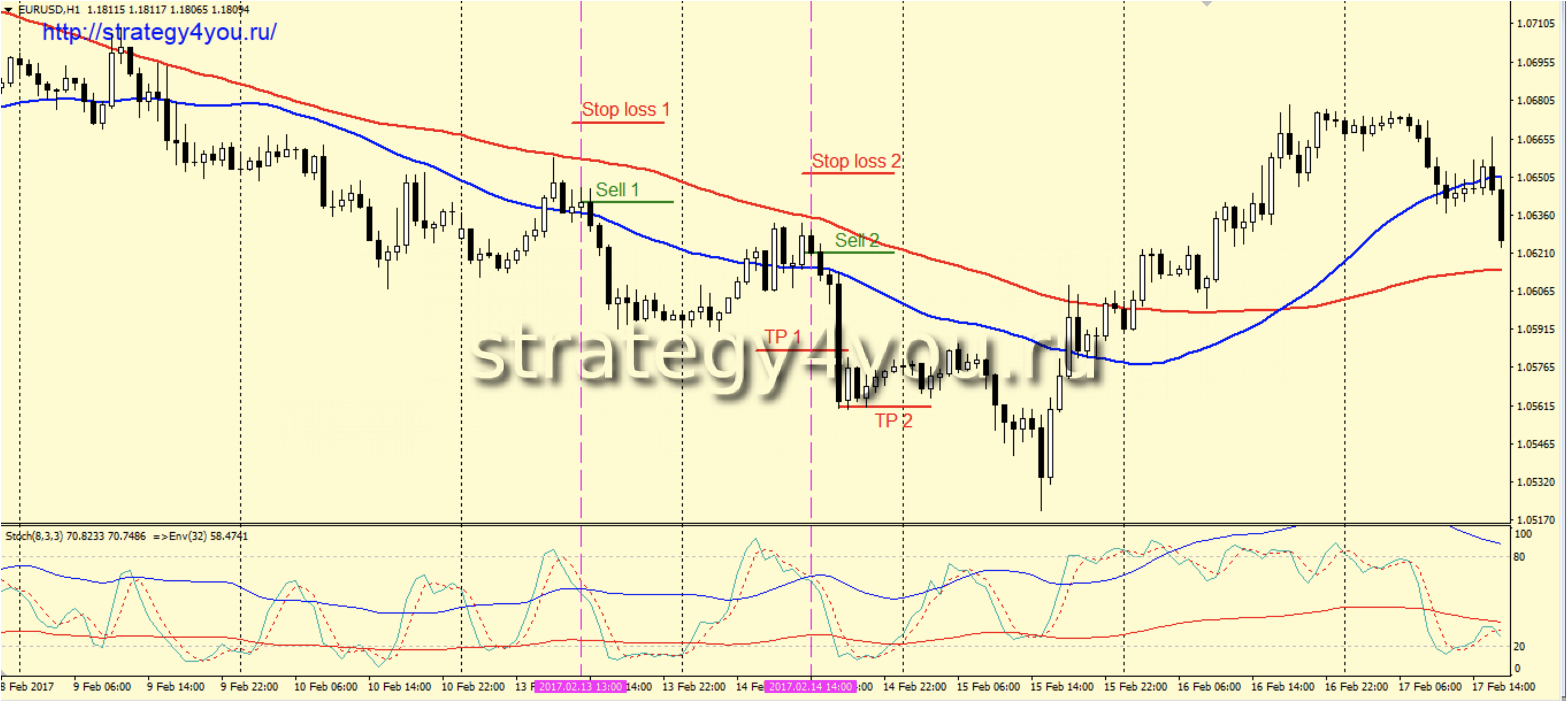 3) Индикатор Stochastic опустился ниже своего уровня 80 и так же пересек сверху вниз верхнюю линию Envelopes.