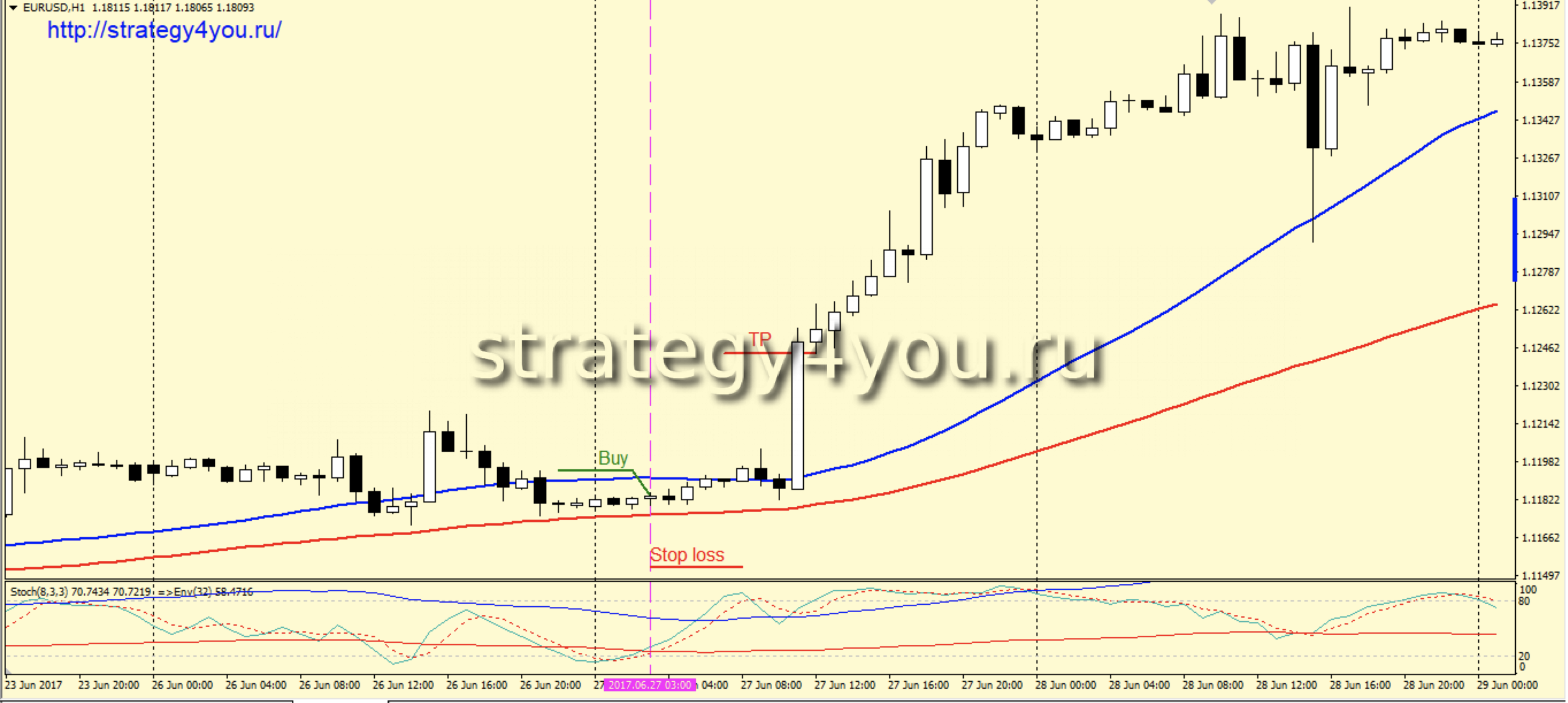 3) Индикатор Stochastic вышел из-под своего уровня 20 и так же пересек снизу вверх нижнюю линию индикатора Envelopes.