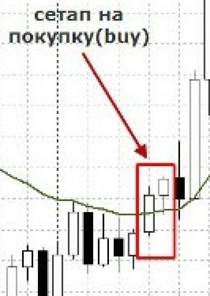 Для определения сетапа на покупку или продажу мы будем использовать свечной график. Для определения сетапа нам необходимы две свечи расположенные близко к средней, причём цены закрытия обоих свечей должны находиться по одну сторону от средней. Для сетапа на покупку выше средней, для сетапа на продажу – ниже. Следует отметить, что тело и тени 1-ой свечи могут пересекать среднюю.»