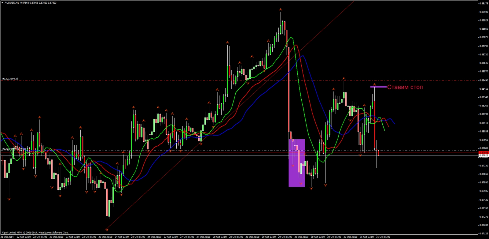 4) Стоп-лосс устанавливаем под последний фрактал, направленный вниз.