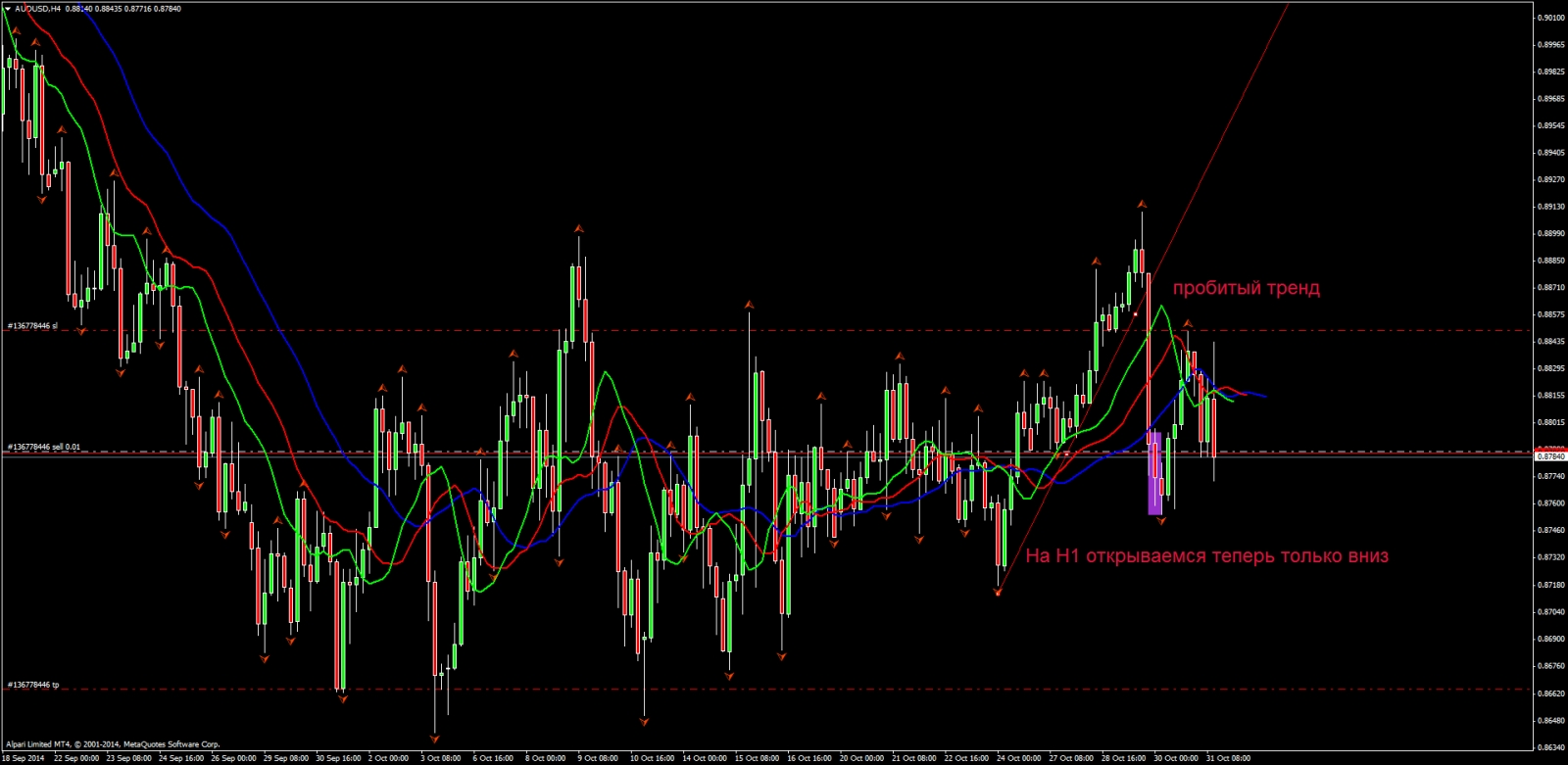 Предлагаю ориентироваться на Н4,после пробития тренда. Выставляем отложенники на Н1 только в этом направлении.Стоп ставим над верхушкой отката.Профит от «жадности».