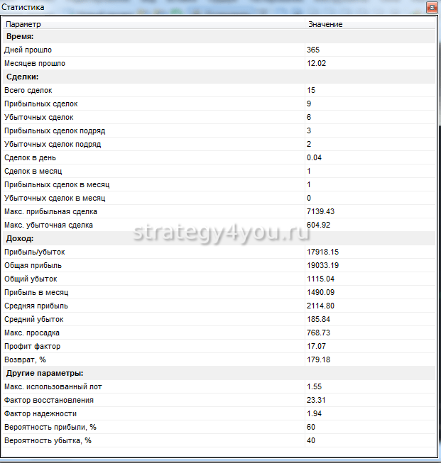 Хотя вход в рынок осуществляется на часовом интервале, но сделок за один год не так много (около 10). По этой причине она хорошо подойдет занятым людям, которые не могут постоянно находиться у монитора, но обладают достаточными средствами и знаниями, чтоб получать прибыль, превышающую процентные ставки в банке.