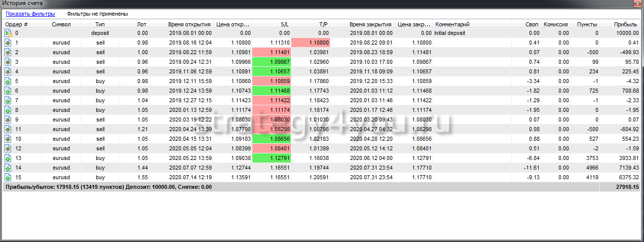Основной целью являются сделки в 500-700 пунктов (при стопе 50 пунктов для 4-х знака), но и в те года, в течении которых не было хороших движений, стратегия приносила около 50% годовых.