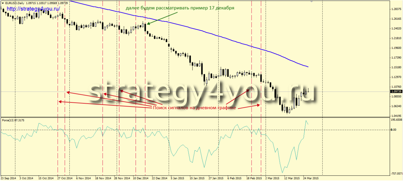 - Индикатор Force Index периодом 13. Имеется в терминале по умолчанию. Устанавливается на дневной график.