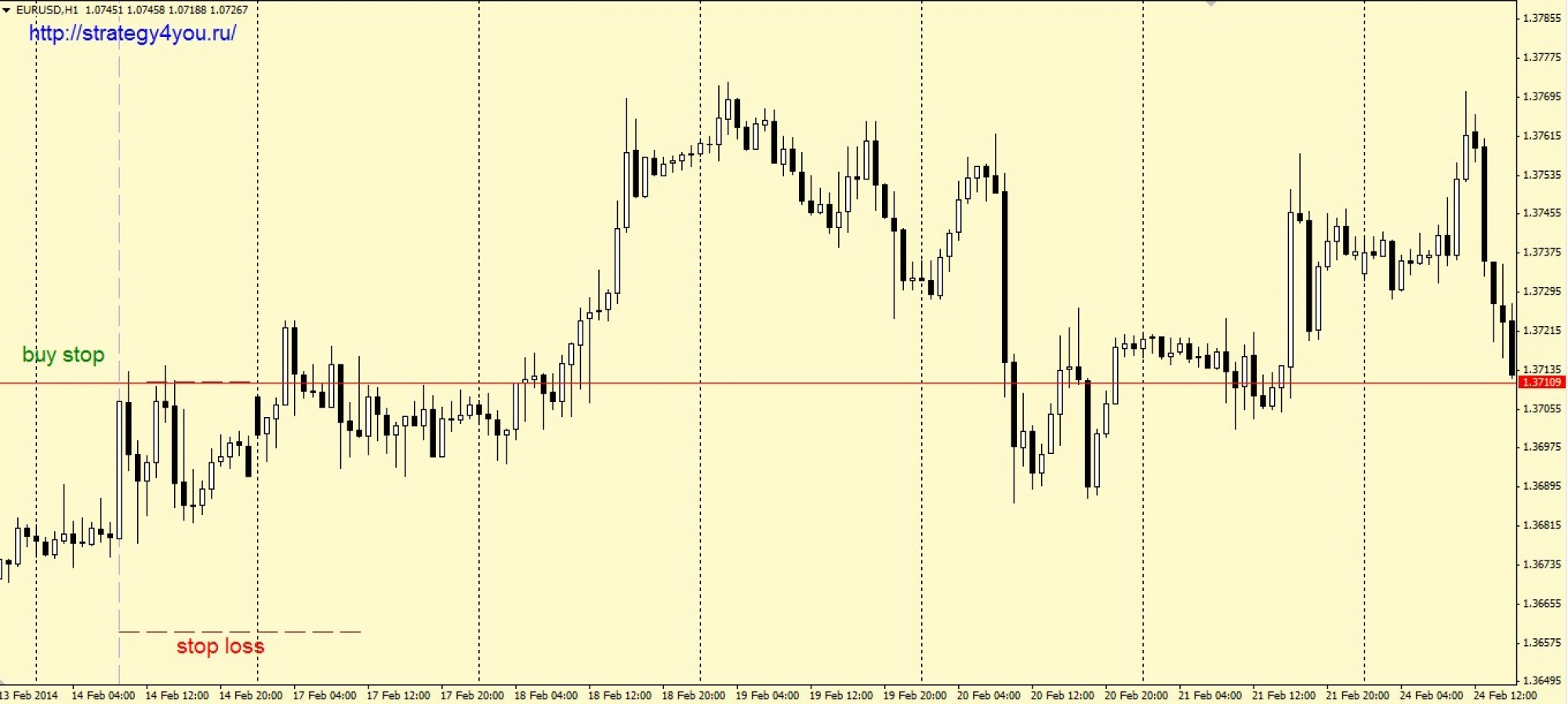 3) После этого весь следующий день (после 8:00 GMT/ 10:00 альпари) мы будем искать точку входа на часовом графике.